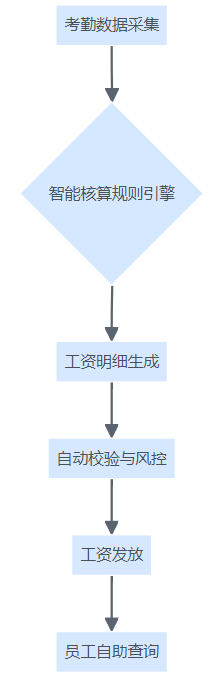 智能工资管理系统自动化流程结构图,涵盖从考勤数据采集到员工自助查询的全链路