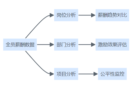 多维度薪酬数据分析看板结构图,展示岗位、部门、项目等多角度分析与决策支持路径