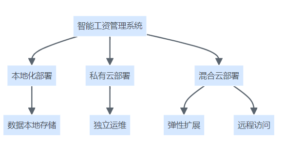 智能工资管理系统多元部署模式结构图,展示本地化、私有云、混合云等多种部署方式的特点与适用场景