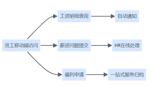 员工通过移动端访问智能工资管理系统,实现工资查询、薪资问题提交和福利申请等自助服务流程结构图
