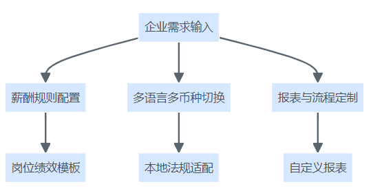 智能工资管理系统个性化与定制化配置结构图,涵盖规则配置、多语言多币种、报表流程等功能链路
