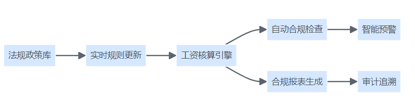 智能工资管理系统合规性支持流程结构图,显示规则更新、合规检查、报表生成与审计追溯全链路