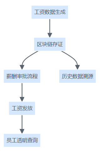 智能工资管理系统中,工资数据经区块链存证、审批、发放,到员工查询全流程结构示意图