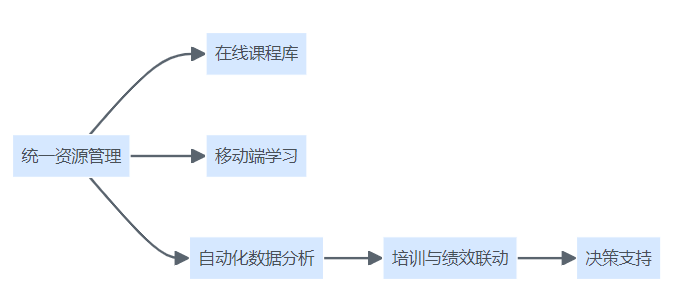 员工培训管理平台数字化功能结构图,展示资源管理、课程库、移动学习、数据分析与决策支持的关系。