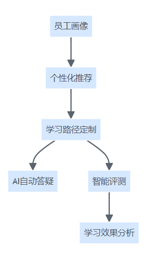 智能化员工培训平台的生态结构图,展示员工画像、个性化推荐、路径定制、AI答疑、智能评测与学习效果分析。