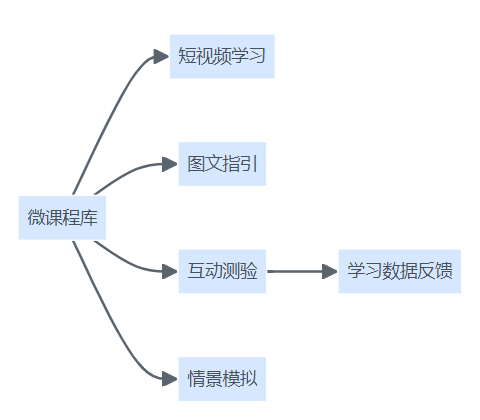 微学习模式在员工培训管理平台的应用结构图,包括微课程库、短视频、图文指引、互动测验、情景模拟和数据反馈。
