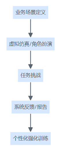 体验式学习在员工培训管理平台的流程图,包括业务场景定义、虚拟仿真、任务挑战、系统反馈和个性化强化训练。