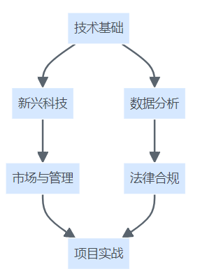 跨学科融合课程体系结构图,展示技术基础、新兴科技、数据分析、市场管理和法律合规等内容的交互融合。