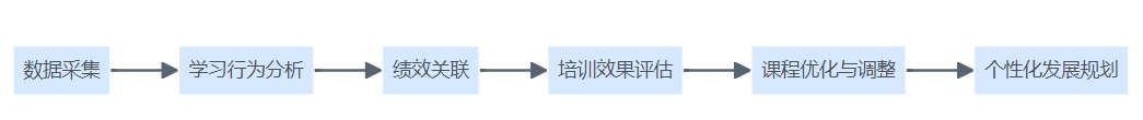 数据驱动员工培训管理平台核心流程图,涵盖数据采集、行为分析、绩效关联、效果评估、课程优化和个性化发展规划。