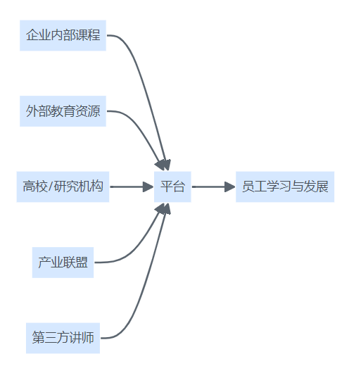 培训平台生态化赋能结构图,展示企业课程、外部教育资源、高校、产业联盟和第三方讲师等多元供给汇聚至平台,为员工学习发展赋能。