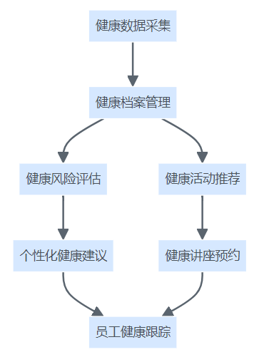 员工健康与福祉综合管理系统结构图,展示数据采集、风险评估、活动推荐与健康跟踪全流程