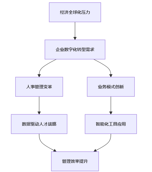 企业数字化转型驱动力结构图,展示经济压力、业务创新、数据驱动、智能工具应用如何共同推动人事管理变革。