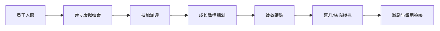 员工数字孪生流程图,展示从入职、档案建立、技能测评到晋升模拟和激励策略的数字化管理路径。