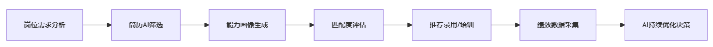AI智能人事决策流程图,展现从岗位需求、简历筛选、能力画像到录用决策和后续优化的智能化流程。