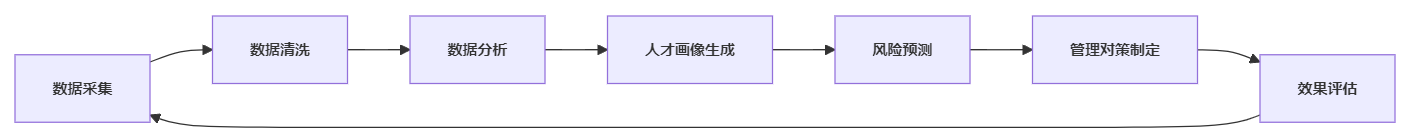 人才分析与预测流程图,展示从数据采集、分析、风险预测到管理决策和效果评估的完整闭环。