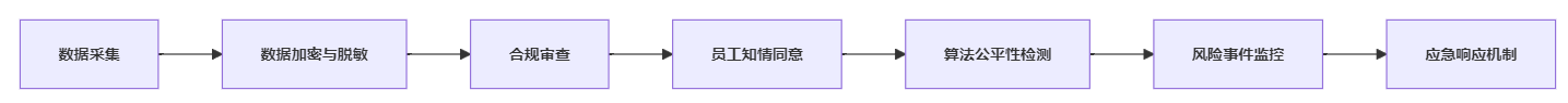 人事管理数字伦理防控流程图,展示从数据采集、加密、合规审查,到公平性检测和应急响应的全过程防控。