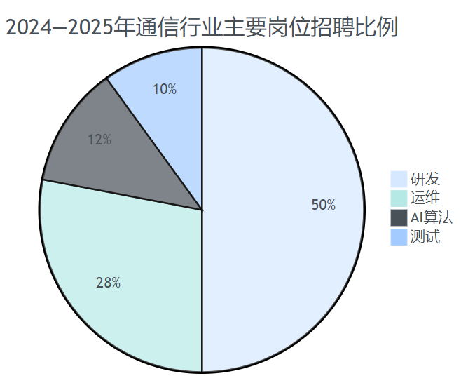 2025年研发、运维、AI算法、测试岗位在通信行业招聘中的比例饼图