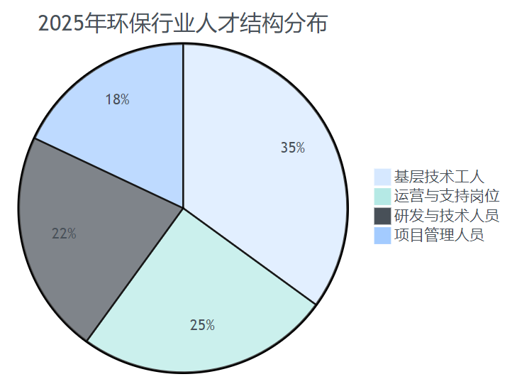 环保行业2025年人才结构分布饼图,显示基层技术工人、项目管理、研发技术及运营岗位比例