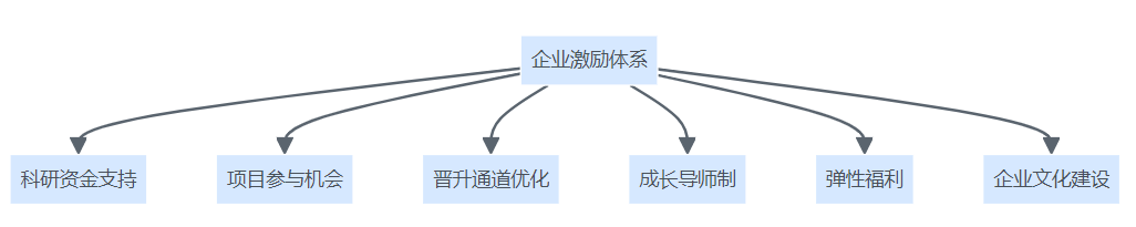 环保行业企业激励机制结构图,展示科研资金、项目机会、晋升通道、成长导师等多元激励方式