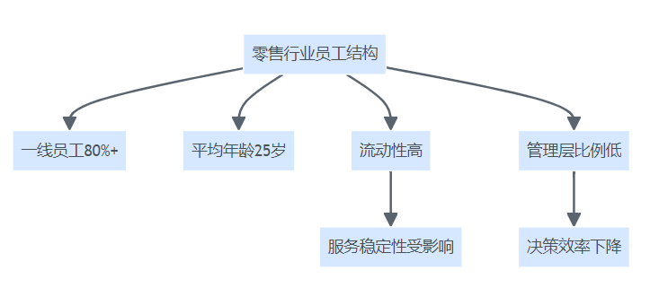 2025年零售行业员工结构图,突出一线员工占比、年龄分布、流动性与管理层比例特点。