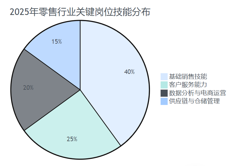 2025年零售行业关键岗位所需技能分布图,显示基础销售、客户服务、数据分析、电商及供应链管理的占比。