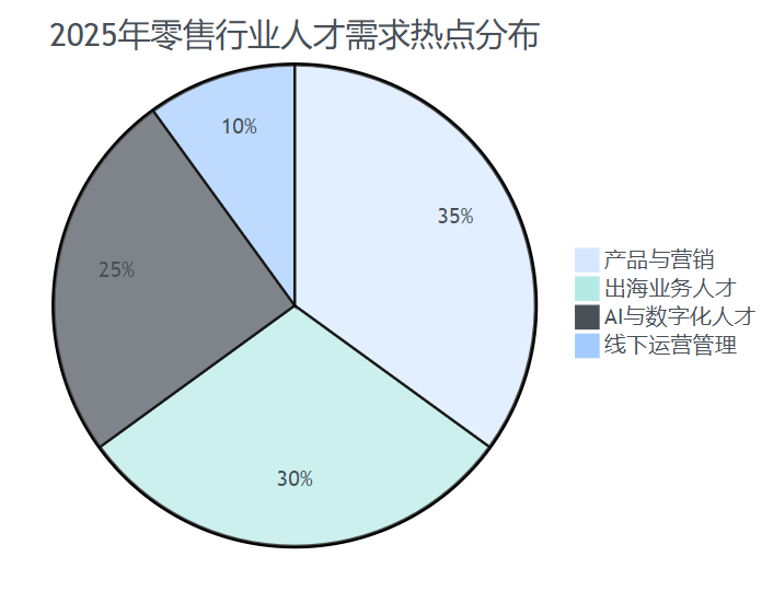 2025年零售行业人才需求热点分布图,展示产品营销、出海、AI数字化与线下管理等岗位的占比。