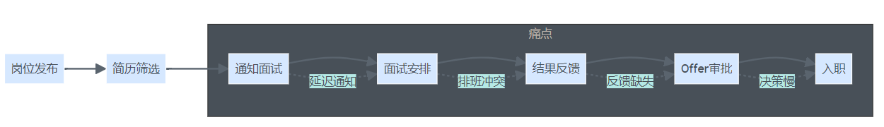 候选人体验管理流程痛点示意图,展示通知延迟、排班冲突、反馈缺失与决策迟缓等环节问题
