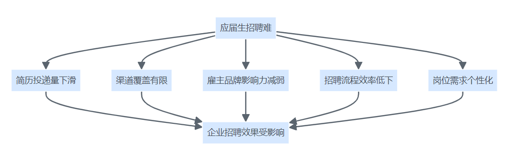 应届生招聘难的挑战结构图,显示简历投递量、渠道覆盖、品牌影响、流程效率与岗位需求等因素共同影响企业招聘效果。