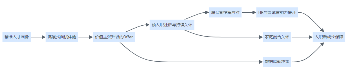 为进一步梳理解决高端人才拒绝Offer的流程创新路径,以下结构图以系统流程为主线,串联“人才画像—面试体验—Offer管理—家庭关怀—入职发展”等关键节点: