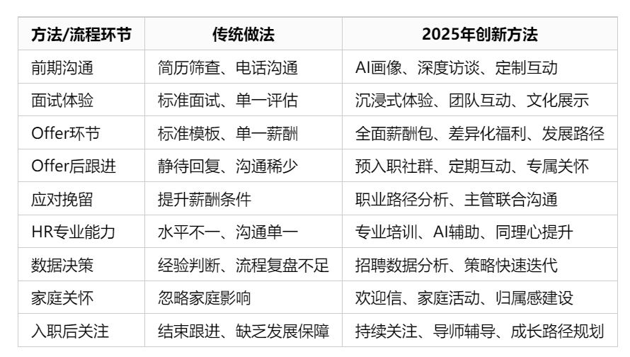 以往HR面对原公司挽留,往往只能提升Offer条件。创新做法则是帮助候选人理性分析原公司挽留的长期影响,提醒其最初离职的初衷,联合用人部门展示企业独有的发展机会和成长空间。HR与业务主管可共同参与深度沟通,强化企业在技术、管理、文化等方面的优势,打消候选人顾虑。