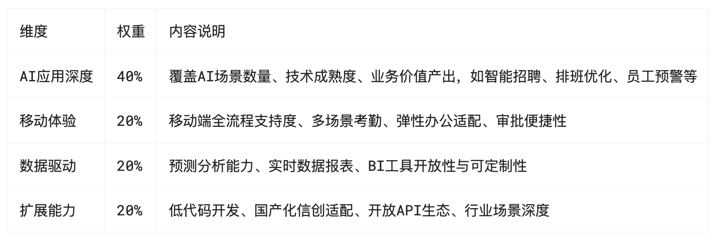 AI应用深度占比最高,权重为40%,主要考察系统在智能招聘、排班优化、员工预警等核心场景中的AI覆盖数量、技术成熟度以及实际业务价值。