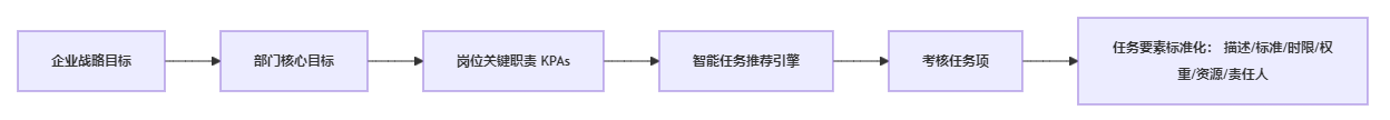 系统核心在于构建“组织目标->部门目标->岗位目标->考核任务”的智能分解链路。