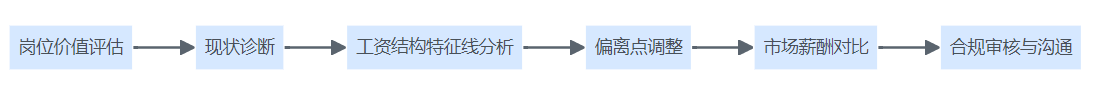 工资结构调整流程图,依次展示岗位评估、诊断、结构线分析、偏离点调整、市场对标和合规沟通等环节。