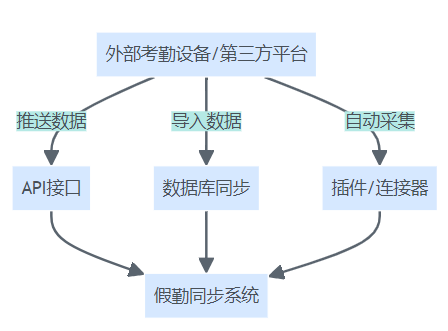外部考勤设备通过API接口、数据库同步、插件等不同技术路径接入假勤同步系统。