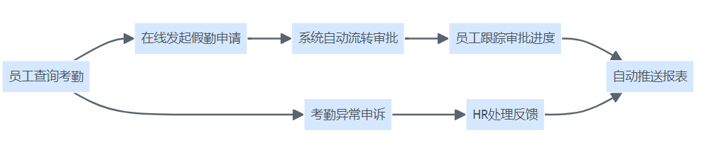 员工可查询考勤、发起假勤申请、申诉异常,系统自动流转审批并推送考勤报表,实现考勤服务的闭环。