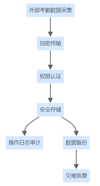 考勤数据采集后经加密传输、权限认证、安全存储,配合日志审计、数据备份与灾难恢复实现全程安全管控。