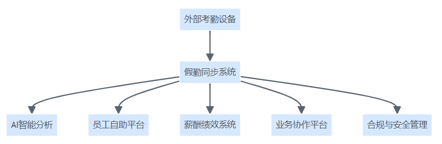 假勤同步系统作为数据中枢,连接外部考勤设备、AI智能分析、员工自助平台、薪酬绩效系统、业务协作平台,实现合规与安全管理。
