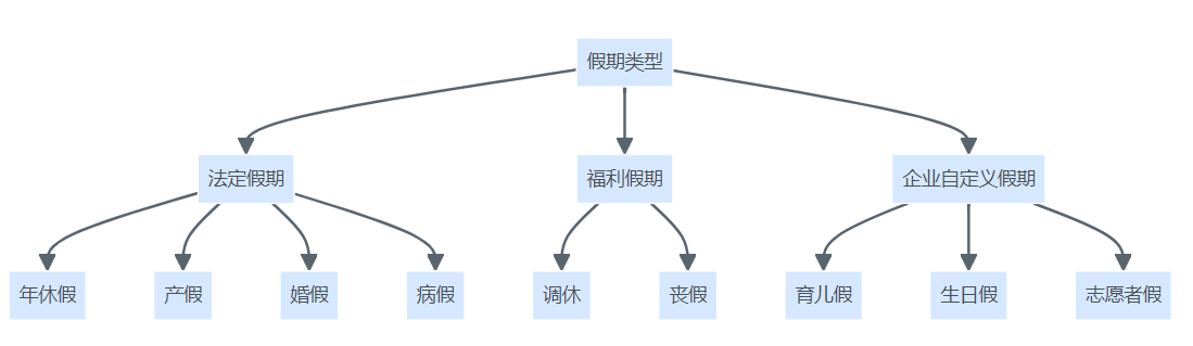 假期类型分为法定假期、福利假期和企业自定义假期,各自包含不同具体假期种类。
