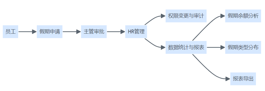 假期管理权限与数据统计结构图展示员工、主管、HR的权限流转,以及数据统计与报表分析流程。