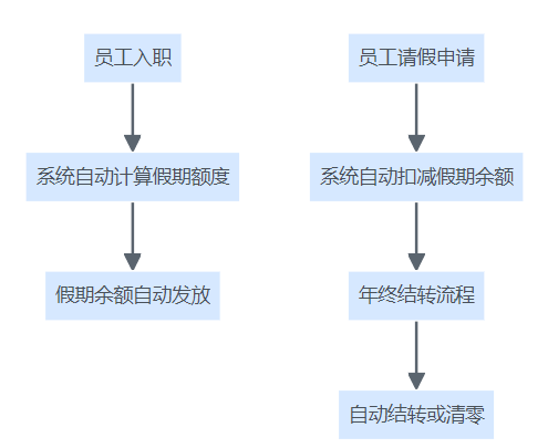 企业假期管理自动化流程图,展示从员工入职到假期自动计算、发放、扣减、结转全流程。
