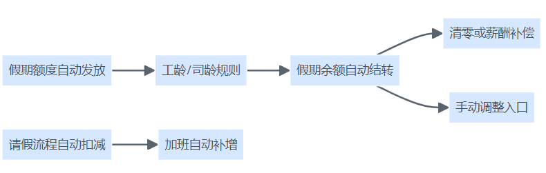 建议HR部门先行明确假期类型、结转政策、业务流程(如加班调休、弹性假期、跨区域规则等),并与IT团队联合梳理系统需求。通过需求拆解,将“假期自动发放、自动结转、自动扣减、手动调整”等核心功能流程化,确保落地后系统能全面支持企业管理场景。