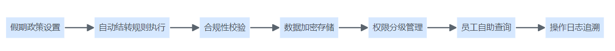假期管理系统合规与安全流程图,涵盖政策设置、自动结转、合规校验、数据安全、权限管理、员工查询、日志追溯等环节。
