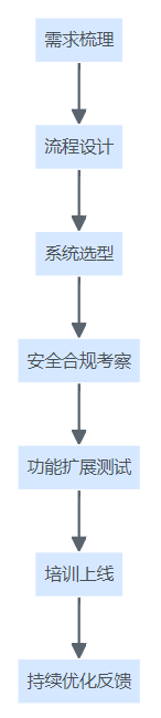 系统选型与落地流程图,体现从需求梳理、选型、部署到培训与持续优化的全流程管理。