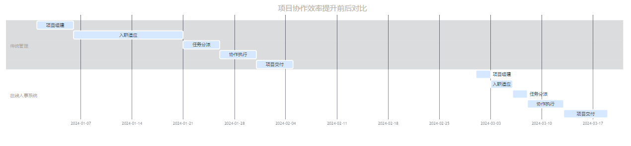 对比传统管理与系统化管理下项目组建、入职适应、任务分派等环节的时间变化
