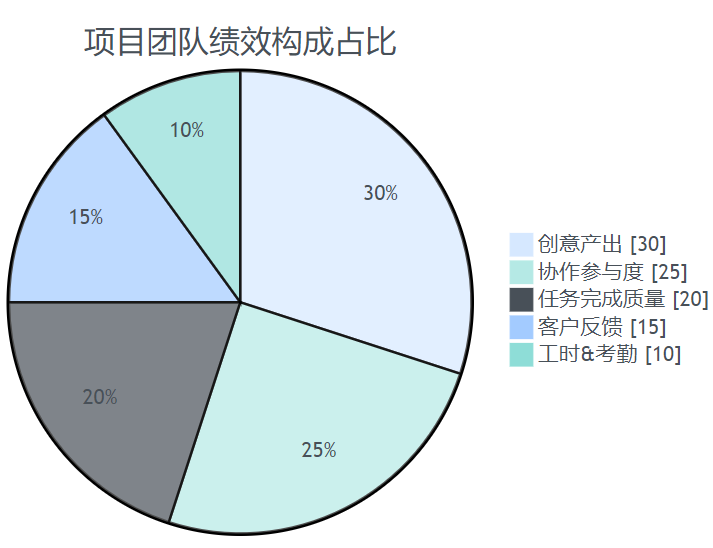 项目团队绩效评价由创意产出、协作参与度、任务完成质量、客户反馈及工时考勤等多维度构成