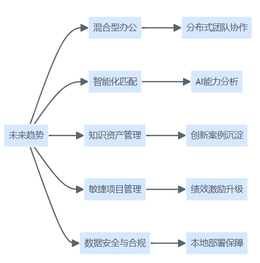 未来趋势包括混合型办公、智能化匹配、知识资产管理、敏捷项目管理和数据安全等方向