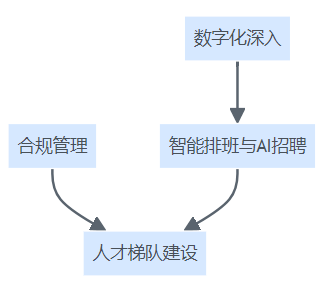智能制造业未来用工趋势包括数字化、合规管理、人才梯队和智能排班等方向的结构图