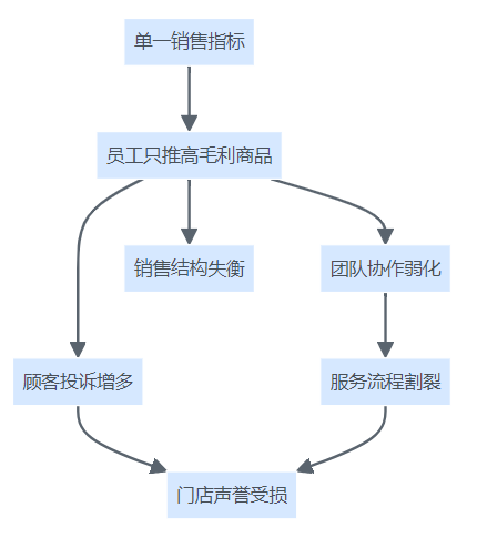 员工动力分化:部分营业员为追求高业绩,忽视低毛利或常规品类的推广,造成销售结构失衡。