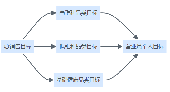 智能绩效系统将总销售目标分配到高毛利、低毛利和基础健康品类,并下达给营业员