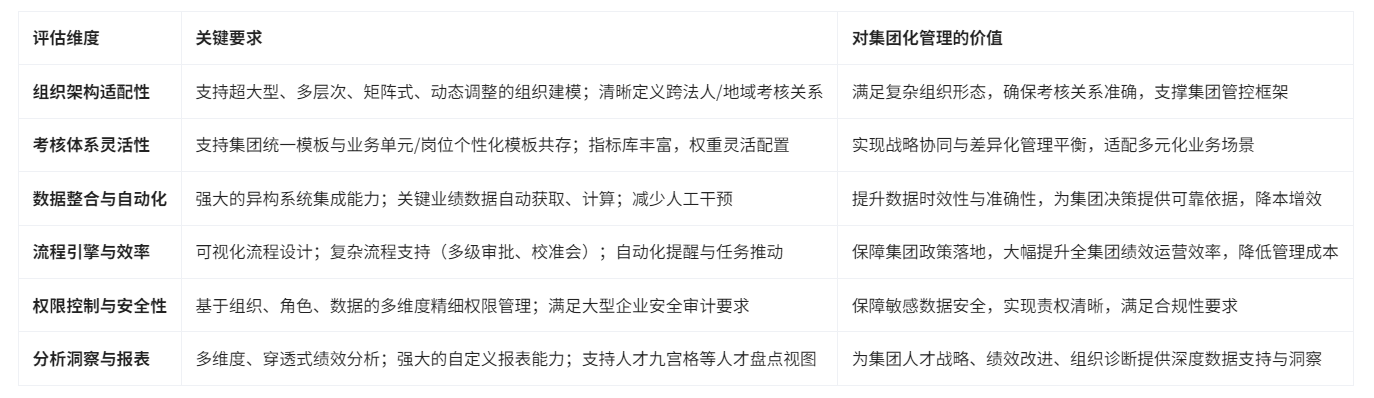 差异化考核是刚需: 不同子公司/事业部的业务逻辑、考核重点差异显著,需要集团在统一框架下赋予充分的自主权,对系统的多级管控和灵活配置能力要求严苛。